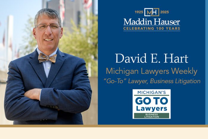 Maddin Hauser is pleased to announce that Michigan Lawyers Weekly selected shareholder David E. Hart as a “Go To” lawyer in business litigation for the second time. David was previously honored in 2023.