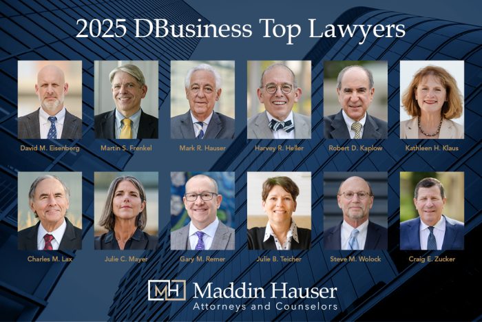 Maddin Hauser is excited to announce that DBusiness Magazine has recognized 12 shareholders on the 2025 list of “Top Lawyers in Metro Detroit.” New to the list this year, David Eisenberg, Julie Mayer, and Gary Remer are named as a testament to their skills and reputation among their peers.