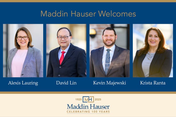 As Maddin Hauser continues its thoughtful approach to growth and celebrates its 100th anniversary in 2025, onboarding this skilled team of attorneys follows the firm’s other recent additions, strengthening its commercial litigation, estate planning, probate litigation, and corporate capabilities. These four new attorneys bring fresh insights and perspectives while delivering exceptional service to our clients.