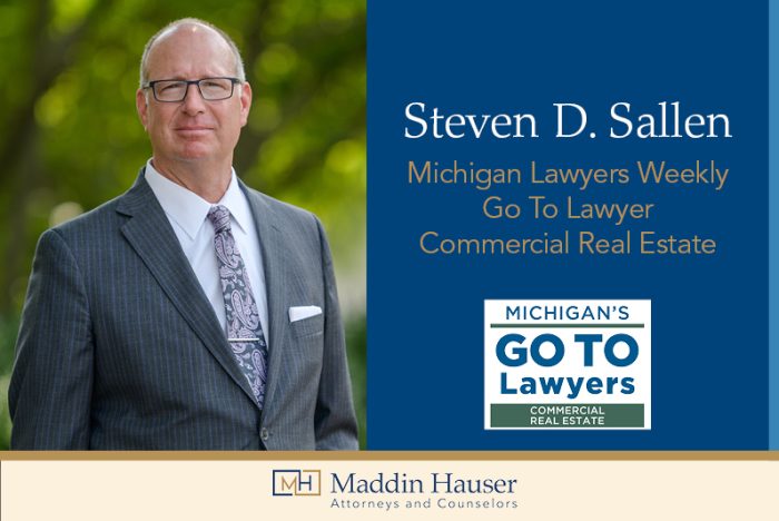 Maddin Hauser is pleased to announce that Michigan Lawyers Weekly named Steven D. Sallen a “Go-To” lawyer in commercial real estate for the second time. Steve was previously recognized in 2021 and selected for Michigan Lawyers Weekly’s Hall of Fame in 2020. He has earned praise for his legal acumen in several peer-reviewed listings, including Best Lawyers in America, Super Lawyers, Leading Lawyers, and DBusiness Top Lawyers.