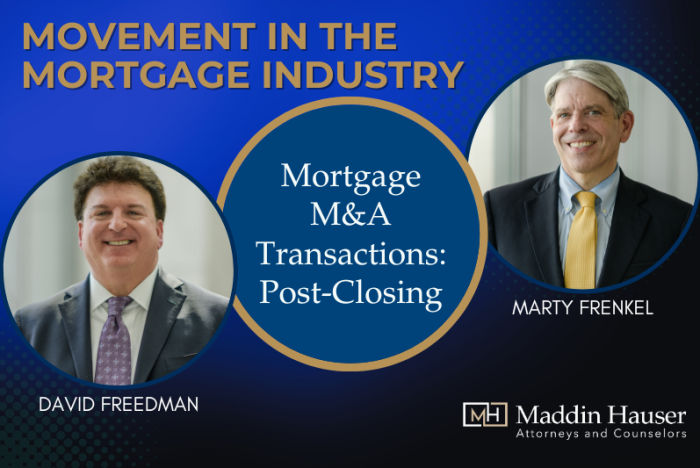 In the fourth and final episode of our “Movement in the Mortgage Industry” series, attorneys Marty Frenkel and David Freedman dive into the often-overlooked legal challenges that follow a mortgage industry merger or acquisition. Post-closing doesn’t mean the work is done—in fact, it’s where key issues often arise.